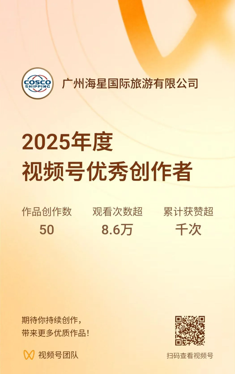 2月5日,广州海星国际旅游有限公司的视频号团队收到了一份暖心的认可——海星旅游视频号荣获微信视频号“2025年度视频号优秀创作者”称号。这份鼓励,是对海星旅游过去一年视频作品创作的肯定,更是前行的动力。 2025年,海星旅游用心打磨了50条视频,初衷就是为了让大家更直观了解海星旅游的全品类产品与服务——从溢满温情的个性化线路设计,到舌尖流连的地道餐饮风味;从绿色低碳的游船体验,到温馨舒适的住宿选择;还有应节暖心的年节产品,以及航运特色的文创周边,每一个画面、每一处细节,都藏着海星旅游对品质的较真、对业务的热忱,也见证着海星旅游在视频创作中,从摸索到娴熟地成长。 由衷感谢每一位关注、点赞、转发的粉丝朋友们!8.6万次的观看、每一条视频的千次点赞,是你们的厚爱让海星旅游“星品牌‘心’服务”被更多人看见,也让海星旅游的业务产品被更多人了解与信赖。 未来,海星旅游将一如既往深耕视频内容创作,用更生动的方式呈现优质的“航运文旅”产品,用更用心的内容回馈粉丝朋友们的陪伴。期待与你们继续同行,绘就更多美好生活画卷! | |||||||