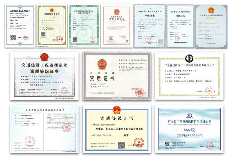 公司持有水运工程监理甲级资质、水运工程机电专项监理资质、房屋建筑工程监理甲级资质、建设项目工程环境能力评价资格甲级(专业涵盖:交通运输、社会区域、农林水利、海洋工程)、市政公用工程监理乙级、水利工程施工监理乙级、水运工程结构(地基)甲级、水运工程材料乙级、公路工程丙级、检验检测机构资质认定证书、造价咨询乙级资质、工程咨询乙级资信;具备工程招标代理AAA级资信、中央投资项目招标代理乙级、广东省政府采购招标代理、广州市政府采购招标代理等多项招标代理资质(资格)。
